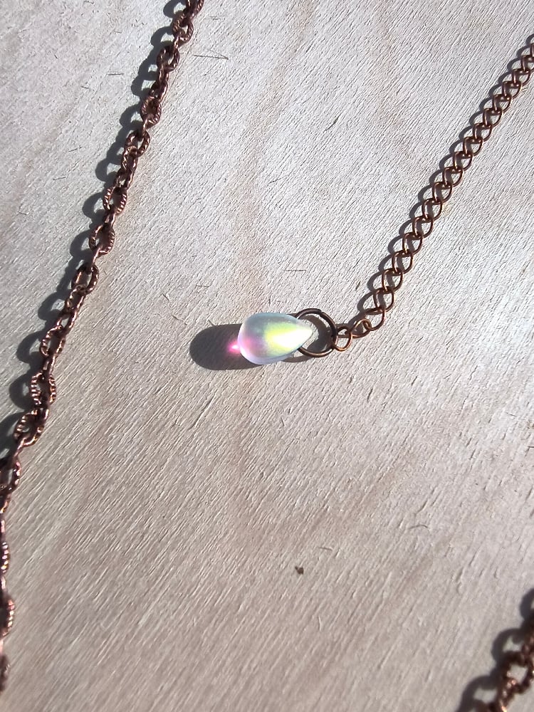 The stamped pendant is made from 8 gauge solid bare copper wire. It has been sprayed to decrease chances of tarnishing or turning skin. With that being said, the pendant might still tarnish or turn your skin if it gets wet.